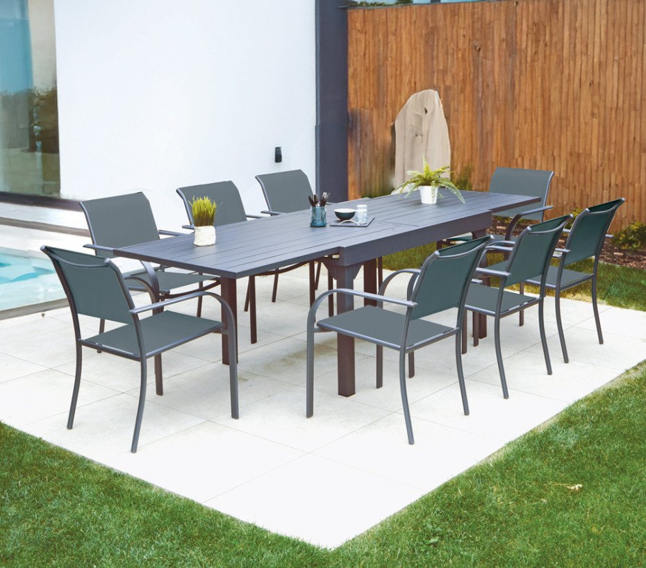 Idéal pour les grands espaces, l’ensemble repas GUETHARIZIERS est composé de la table extensible GUETHARY et de 8 fauteuils de jardin BEZIERS de coloris Gris Anthracite et de dimensions L57xP58xH89 cm.