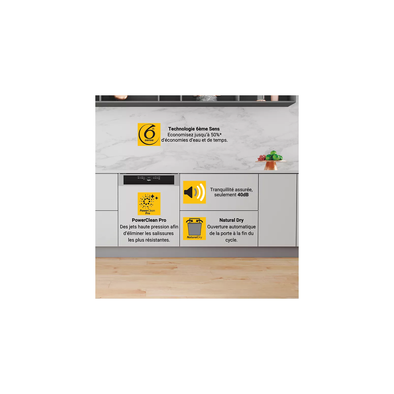 Le lave-vaisselle encastrable WHIRLPOOL WD0BD851AX se distingue par son efficacité énergétique de classe B et ses performances de lavage et de séchage notées A. Grâce à la technologie 6ème Sens, il ajuste automatiquement les paramètres pour une consommation optimisée, permettant jusqu’à 50% d’économies d’eau et de temps par rapport aux cycles traditionnels. Avec une consommation d’eau annuelle de 2660L et seulement 64 kWh utilisés pour 100 cycles Eco, ce modèle est conçu pour réduire l’impact sur l’environnement et les factures d’énergie. Le niveau sonore de 41 dB et la classe sonore B garantissent un fonctionnement discret, tandis que la capacité de 14 couverts répond aux besoins des familles nombreuses ou des réceptions.