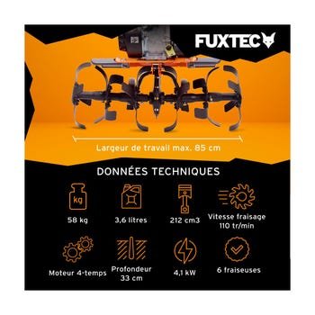 Protégez votre dos, travaillez plus rapidement et plus efficacement avec la motobineuse thermique FUXTEC FX-AF1212 et sa largeur de travail fabuleuse de 85cm
