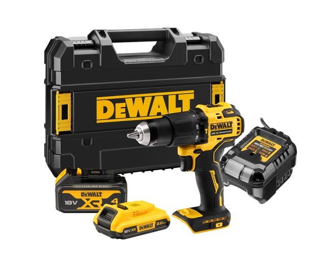 Perceuse-Visseuse Compact à percussion XR 18V DUAL RUN – Moteur Brushless – 2 vitesses (0-450 / 1650 trs/min.) – Cadence de frappe : 28 050 cps/min. – Mandrin métal 13 mm – Jusqu’à 65 Nm pour les applications les plus exigeantes – Ultra-compacte : longueur de 175 mm – Lampe Led – Transmission tout métal à 2 vitesses et 15 réglages de couple – Livrée avec 1 Batterie XR 18V 2Ah, 1 Batterie XR 18 4Ah, 1 Chargeur, 1 Clip ceinture dans 1 Coffret robuste Tstak