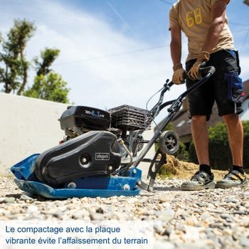 La plaque vibrante SCHEPPACH 5,5 CV – HP1900Sest l’outil idéal pour compacter vos allées et les surfaces. En effet, dotée d’un moteur thermique puissant de 5,5 CV, vous pourrez aisément réaliser une pression de compactage de 17000 N et une profondeur de compactage de 30 cm. Vos travaux pourront être réalisés rapidement grâce à l’entraînement automatique présent, qui lui permet d’atteindre une vitesse de 25 m/min. De plus, grâce à ce système d’entrainement, vous pourrez intervenir à tout moment pour ajuster la direction de déplacement de la plaque vibrante.