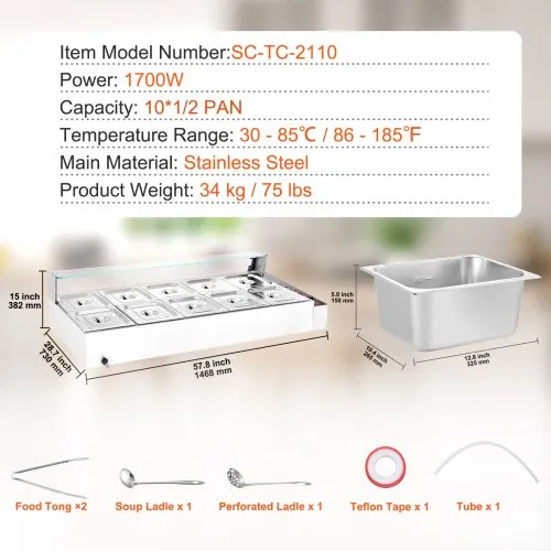 Caractéristiques et détails Chauffage rapide, chaleur durable : cet impressionnant chauffe-plats avec couvercle en verre est doté d’un puissant tube chauffant en acier inoxydable de 1 700 watts qui réchauffe rapidement vos aliments pour conserver leurs saveurs chaudes et délicieuses. Vous pouvez régler la température de sortie selon vos préférences, entre 30 et 85 °C, grâce au régulateur de température. Construction robuste en acier inoxydable : ce chauffe-plats est conçu pour durer, avec une construction robuste entièrement en acier inoxydable qui peut résister à une utilisation constante et est facile à nettoyer et à entretenir. Le puits a une paroi épaissie (0,03″ / 0,8 mm d’épaisseur) qui offre une robustesse supplémentaire et dispose d’un joint d’étanchéité sécurisé. Sécurité supplémentaire : nous avons amélioré notre chauffe-plats avec un « indicateur de combustion à sec » et un « bouton de réinitialisation » nouvellement conçus. La fonction d’indicateur de combustion à sec arrête automatiquement de chauffer les aliments lorsque la température dépasse 120 °C (248 °F). Pour reprendre les opérations, vous devez appuyer sur le bouton de réinitialisation. Détails Conçu pour vous : Le puits est soigneusement conçu avec des repères de niveau d’eau à l’intérieur pour un entretien sans effort de l’eau. Le récipient est doté d’un robinet pour vidanger l’eau après utilisation, réduisant ainsi les tracas liés au nettoyage de l’intérieur de la machine. De plus, deux louches à manche extra long sont incluses, parfaitement adaptées aux casseroles profondes. Comprend 10 casseroles : notre chauffe-plats commercial est livré avec dix casseroles de 7,6 litres (taille 10 x 1/2) accompagnées de leurs couvercles respectifs, vous permettant de servir différents plats simultanément. N’hésitez pas à changer votre menu en passant des soupes et des sauces aux ragoûts, ou même au fromage nacho et au chocolat.