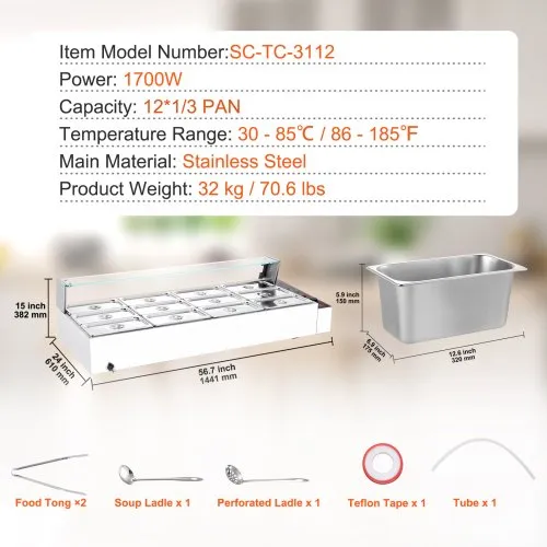 Caractéristiques et détails Chauffage rapide, chaleur durable : cet impressionnant chauffe-plats avec couvercle en verre est doté d’un puissant tube chauffant en acier inoxydable de 1 700 watts qui réchauffe rapidement vos aliments pour conserver leurs saveurs chaudes et délicieuses. Vous pouvez régler la température de sortie selon vos préférences, entre 30 et 85 °C, grâce au régulateur de température. Construction robuste en acier inoxydable : ce chauffe-plats est conçu pour durer, avec une construction robuste entièrement en acier inoxydable qui peut résister à une utilisation constante et est facile à nettoyer et à entretenir. Le puits a une paroi épaissie (0,03″ / 0,8 mm d’épaisseur) qui offre une robustesse supplémentaire et dispose d’un joint d’étanchéité sécurisé. Sécurité supplémentaire : nous avons amélioré notre chauffe-plats avec un « indicateur de combustion à sec » et un « bouton de réinitialisation » nouvellement conçus. La fonction d’indicateur de combustion à sec arrête automatiquement de chauffer les aliments lorsque la température dépasse 120 °C (248 °F). Pour reprendre les opérations, vous devez appuyer sur le bouton de réinitialisation. Détails Conçu pour vous : Le puits est soigneusement conçu avec des repères de niveau d’eau à l’intérieur pour un entretien sans effort de l’eau. Le récipient est doté d’un robinet pour vidanger l’eau après utilisation, réduisant ainsi les tracas liés au nettoyage de l’intérieur de la machine. De plus, deux louches à manche extra long sont incluses, parfaitement adaptées aux casseroles profondes. Comprend 12 casseroles : notre chauffe-plats commercial est livré avec douze casseroles de 4,7 litres (taille 12 x 1/3) accompagnées de leurs couvercles respectifs, vous permettant de servir différents plats simultanément. N’hésitez pas à changer votre menu en passant des soupes et des sauces aux ragoûts, ou même au fromage nacho et au chocolat.
